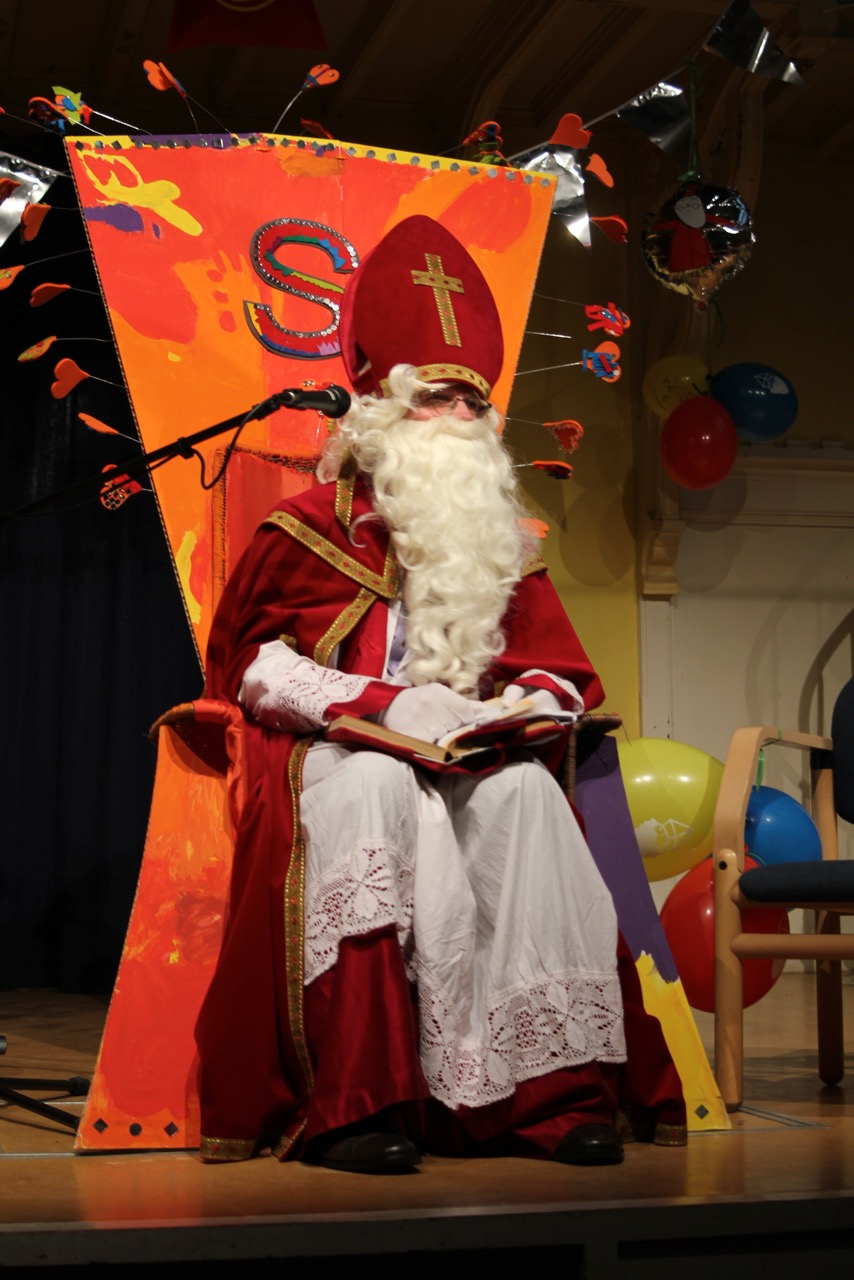 Nadat alle kinderen zich op het Eikenplein opgesteld hadden, werd de Sint, onder luid gezang welkom geheten. Samen met zijn pieten veroorzaakte hij een flinke janboel. Overal lagen pepernoten. Daarna volgende de officiele ontvangst van de goedheiligman in de aula van de school. De kinderen lieten met zang en dans weten hoe welkom hij was. Daarna bracht Sint aan iedere klas een bezoek en deelde hij kadotjes uit.