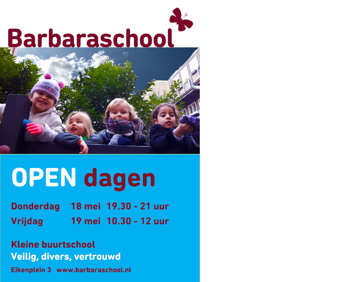 Op woensdag 11 oktober 2017, om 20:00 uur, organiseren ouders van de Barbaraschool een informatie-avond voor geïnteresseerde ouders, om ervaringen te delen en om vragen te beantwoorden. Wees welkom op de Vrolikstraat 266a in Amsterdam. U kunt zich aanmelden via [email protected]